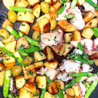 5. Heat 1 tbsp olive oil in a pan over medium heat. Add the potatoes cook around 2 to 3 minutes, then add the octopus, green olives and cook again only 1 minute.